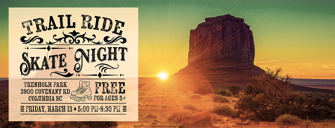 Where them skates at? Come out to our Trail Ride Skate Night! Come and show off your cowboy hats and put them skates on the ground! This skate night allows patrons to come out and skate around and enjoy music and other people in the community who love to skate! For more information, call Trenholm Park at (803) 787-0216.